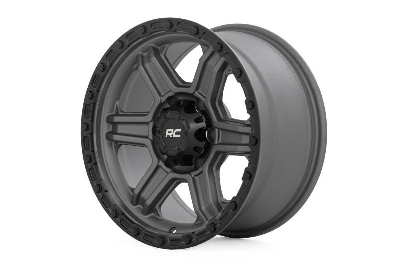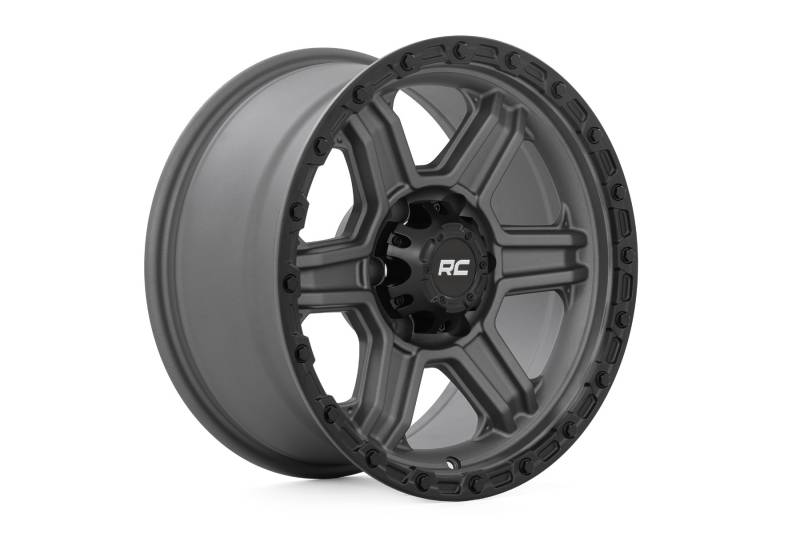 - Gunmetal Gray with Black Ring: Gunmetal gray finish with a sleek black ring, creating a bold, rugged look perfect for off-road enthusiasts.\ 6-Spoke Design: The dynamic 6-spoke design combines durability with aggressive styling for the perfect off-road look and strength.\ Single-Piece Aluminum Construction: Lightweight yet strong single-piece aluminum construction for improved off-road performance and durability.\ Rough Country Black Center Cap:Includes a Rough Country black center cap for a clean, rugged finish that enhances the wheel's off-road look.\ 1-Year Finish & Limited Lifetime Structural Warranty:Backed by a 1-year finish and limited lifetime structural warranty for durability and peace of mind..