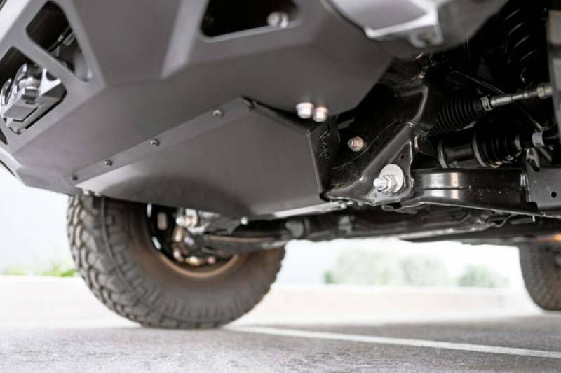 Our 4th Gen Tacoma Skid Plate pairs with our Tacoma Center Mount Front Bumper for added protection from obstacles and added durability to the front end of your truck. The plates improved approach angle helps to deflect impacts that are often encountered when driving off-road. Made from high-quality heavy-duty 3/16 aluminum, our skid plate is built to withstand the tough outdoor environment. For a modern look, the plate is finished in a durable satin black powder coat that complements your trucks and the bumpers styling. As always, our skid plate is proudly made in America.