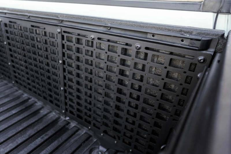 Our 3rd Gen Tundra Bed Cab Molle Storage Panels are the ultimate cargo solution designed specifically for off-roaders, overlanders, and individuals who require efficient gear storage for everyday purposes. Built to endure the most challenging trails and ensure the safety of your valuable items, these panels are a must-have addition to your Tundra. Our Panels provide a versatile platform for attaching and organizing your trail gear. We designed our Tundra molle panels to make full use of vertical bed space. With a range of attachment systems including quick fist mounts, molle straps, bolts, and other tactical solutions, you have the freedom to customize your storage space according to your needs. These panels offer the flexibility you need to securely store and access your equipment.\nCrafted from top-quality steel, these panels maximize cargo storage while keeping the main bed space free for larger items. You can conveniently bring along all your essential tools such as shovels, hi-lift jacks, fluid tanks, recovery gear, and more. Our panels are finished with a hammer black powder coat, ensuring their durability and long-lasting performance. Once installed, the panels remain rigid and secure, yet are easily removable if needed. This protective coating not only adds a sleek and rugged aesthetic to your truck but also shields against rust and harsh weather conditions. These panels are built in the USA and engineered to wit'stand the demands of any adventure you embark upon.\nPlease Note: Some drilling is required for installation.