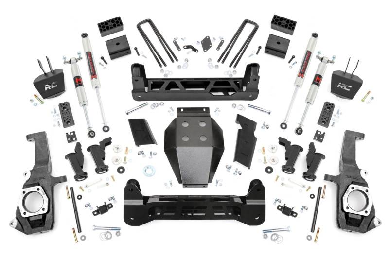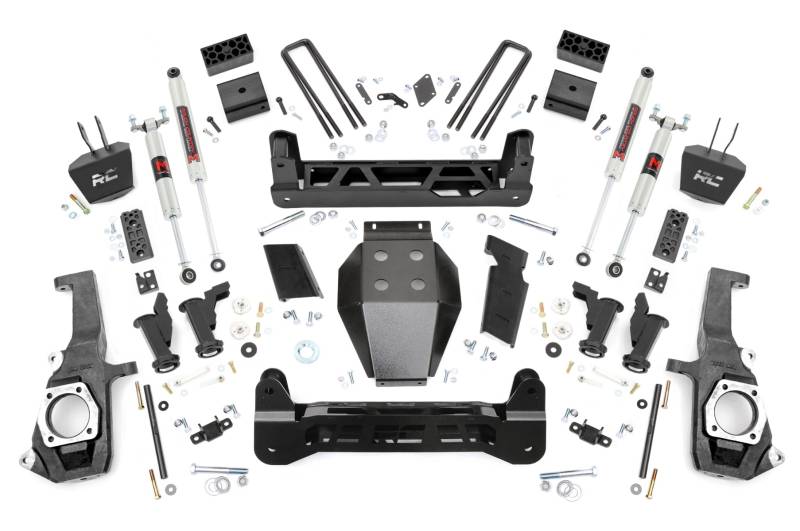 Straight from the lot, the GM 2500HD/3500HD boasts an aggressive stance and sleek design. Inspired by its bold presence, Rough Country developed a suspension kit that enhances its performance without compromising its sharp aesthetics. The 5" Suspension Lift for GM 2500HD/3500HD incorporates a Torsion Drop Design that improves ride quality and handling while maintaining factory angles for a smooth, balanced drive.Torsion Drop Design: Provides improved ride quality and handling, while preserving factory angles for a smooth and controlled drive.Heavy Duty Components: Features 1/4" thick steel crossmembers, Torsion Bar Drop Brackets, and a rugged skid plate, all laser-cut and powder-coated in "Hammer Black" to match factory components.No Drilling or Differential Modifications Required: Install with ease, no invasive modifications needed to maintain the integrity of your truck.Precision Fitment: Designed to preserve the factory ride feel and handling without widening the track width, ensuring your GM 2500 HD stays sharp around corners.Customizable Shock Options: Choose from a range of high-performance shock options, including our nitrogen-charged N3 shocks, V2 monotube shocks, M1 monotube shocks, and adjustable Vertex shocks. The power to select the right shock series for your needs is in your hands.Rough Country's 5" Suspension Lift doesn't just look like it came off the showroom floor, it feels like it too. Achieve the perfect balance of strength, style, and smooth handling with this innovative lift kit, designed specifically to complement your GM 2500HD/3500HD.