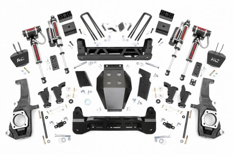 Straight from the lot, the GM 2500HD/3500HD boasts an aggressive stance and sleek design. Inspired by its bold presence, Rough Country developed a suspension kit that enhances its performance without compromising its sharp aesthetics. The 5" Suspension Lift for GM 2500HD/3500HD incorporates a Torsion Drop Design that improves ride quality and handling while maintaining factory angles for a smooth, balanced drive.Torsion Drop Design: Provides improved ride quality and handling, while preserving factory angles for a smooth and controlled drive.Heavy Duty Components: Features 1/4" thick steel crossmembers, Torsion Bar Drop Brackets, and a rugged skid plate, all laser-cut and powder-coated in "Hammer Black" to match factory components.No Drilling or Differential Modifications Required: Install with ease, no invasive modifications needed to maintain the integrity of your truck.Precision Fitment: Designed to preserve the factory ride feel and handling without widening the track width, ensuring your GM 2500 HD stays sharp around corners.Customizable Shock Options: Choose from a range of high-performance shock options, including our nitrogen-charged N3 shocks, V2 monotube shocks, M1 monotube shocks, and Vertex reservoir shocks. The power to select the right shock series for your needs is in your hands.Rough Country's 5" Suspension Lift doesn't just look like it came off the showroom floor, it feels like it too. Achieve the perfect balance of strength, style, and smooth handling with this innovative lift kit, designed specifically to complement your GM 2500HD/3500HD.