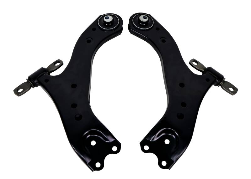 These Whiteline front lower control arms feature high-quality steel and our synthetic elastomer bushings. In addition Whiteline has engineered additional geometry gains with +0.5deg caster improvements into these arms to optimise wheel alignments settings for street and track performance. Caster increases dynamic negative camber on the outside wheel whilst turning, offering more grip without introducing the tyre wear associated with static negative camber. Furthermore the increase in caster improves traction and increases the self-centring effect of the steering. Throw this altogether and the small change in additional caster improves the front-end grip and handling considerably. Whiteline's rear mounted bushing combines the superior mechanical properties of synthetic elastomer formulation with high quality sealed bearing assembly permitting smooth movement of the arm as the wheel moves up and down. Complemented by a front bushing utilizing an oversized heavy duty crush tube, resulting in dramatic improvements to steering precision, most noticeably reduced 'toe-change' during hard cornering, creating impressive turn-in ability! The more positive location of the arm through the range of suspension movement and gains in alignment geometry ensures the car feels more responsive and engaging at turn-in, mid corner and corner exit.