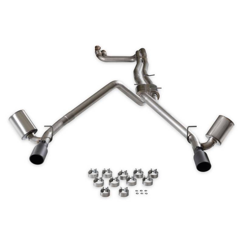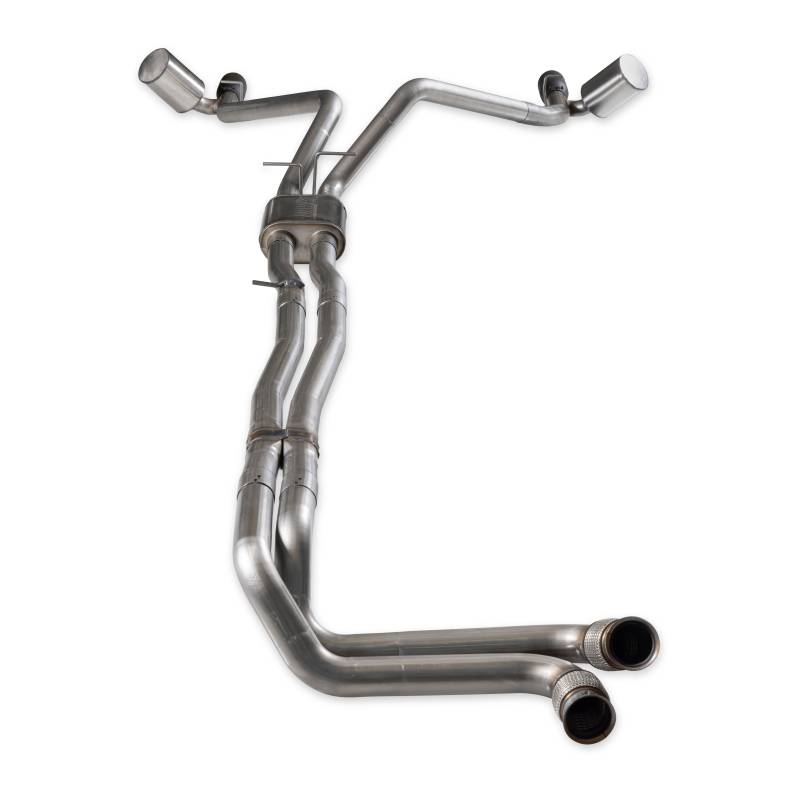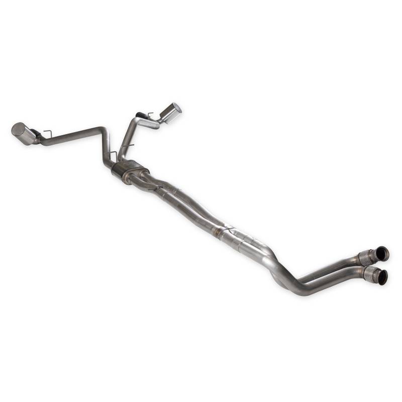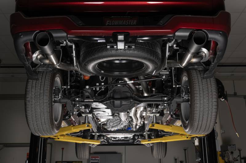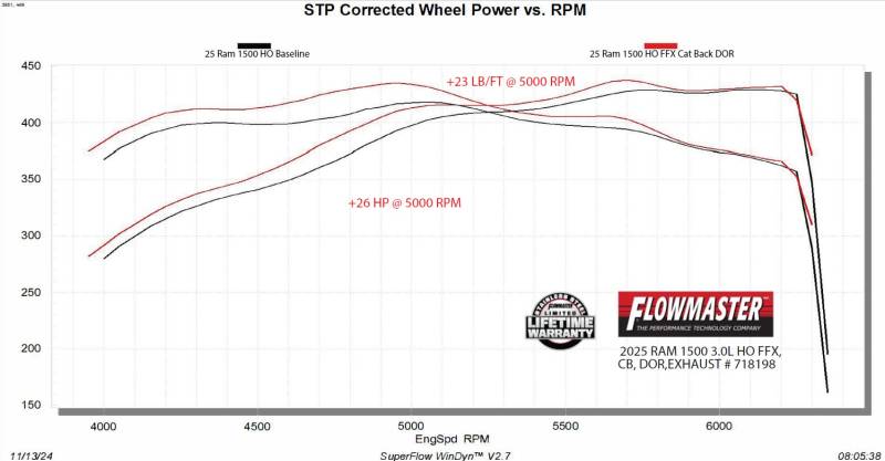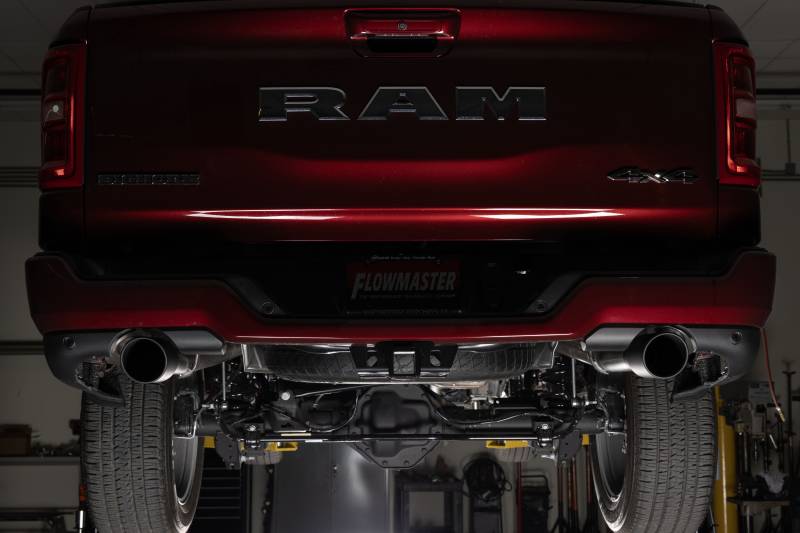 Flowmaster's® Flow FX Cat-back true dual exhaust system for the 2025 - 2026 RAM 1500 with the 3.0-liter Standard and High Output engines gives you a great way to customize your RAM 1500 to your personality. This performance exhaust system fits both 2/4 Wheel drive models and is manufactured from 409 stainless steel for years of trouble-free service and performance. Features include dual 3.00-inch inlet pipes leading into a custom tuned 409 stainless steel Flow FX series "stright through" muffler for great sound and maximum performance. This Cat-back system includes Flowmaster’s exclusive Scavenger X-Pipe with our D-Port technology for maximum exhaust pulse velocity and helps to create a deep exhaust tone. The dual 3.0-inch mandrel-bent tailpipes exit in the stock location in the factory bumper cut outs with 4.5-inch black ceramic coated tips. Included in the tailpipe assemblies are tuned resonators that help maintain a comfortable experience in the cab. On Standard Output models this system turns the exhaust into a true dual style system like the High Output and RHO models. This will allow for better overall performance gains and will work better with any future engne modifications. Max dyno gains of 26 hp and 23 lb-ft at the rear wheels (HO models) deliver power you can feel! The system uses all the factory hanger locations and connections for an easy installation that you can do at home. Kits include installation instructions and all necessary hardware. Backed by Flowmaster's Lifetime Limited Warranty.