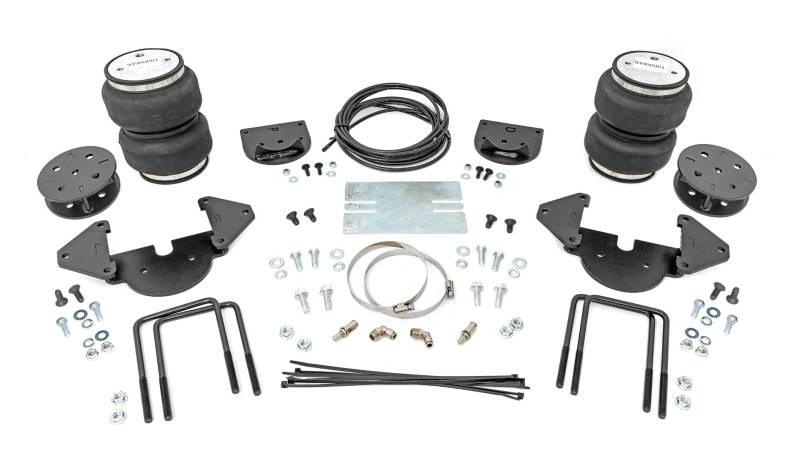 Ideal Leveling: Is your truck your workhorse? The main attraction of a pickup is the ability to haul and tow as needed. However, due to the weight in the bed or the condition of the rear leaf springs, your vehicle may become un-level under load. At Rough Country, we've designed a solution to eliminate these concerns. Introducing Rough Country's Rear Air Spring Kit.Heavy-Duty Construction: Rough Country's Rear Air Spring Kit includes two high-quality, double convoluted air bags, reinforced with durable powder-coated steel brackets and DOT-approved airlines. Whether you're towing a trailer or hauling heavy loads, this kit helps ensure your vehicle remains level, alleviating the strain on your trailer's tongue weight. The kit features 1/4" push-to-connect air fittings for easy installation, along with all necessary bracketry for a secure fit. Rough Country's Air Spring Kit'supports up to 5,000 lbs of load, minimizing sway and preventing bottoming out while braking and steering.Easy Installation: Quick and simple setup for immediate use. Rough Country's kit can be installed at home with standard tools in just 5-6 hours, ensuring minimal downtime and fast, hassle-free installation.Onboard Air Compressor and Wireless Controller: For added convenience, Rough Country offers an optional onboard air compressor and wireless controller to easily adjust your air spring kit on the go. Control air pressure at the push of a button from the comfort of your vehicle.Reliable Warranty Coverage: Rough Country's Rear Air Spring Kit includes a limited lifetime warranty on the air springs and a two-year replacement warranty on the compressor, offering lasting protection against manufacturer defects. This industry-leading coverage ensures confidence in both quality and durability, so you can count on Rough Country to keep your truck performing at its best.