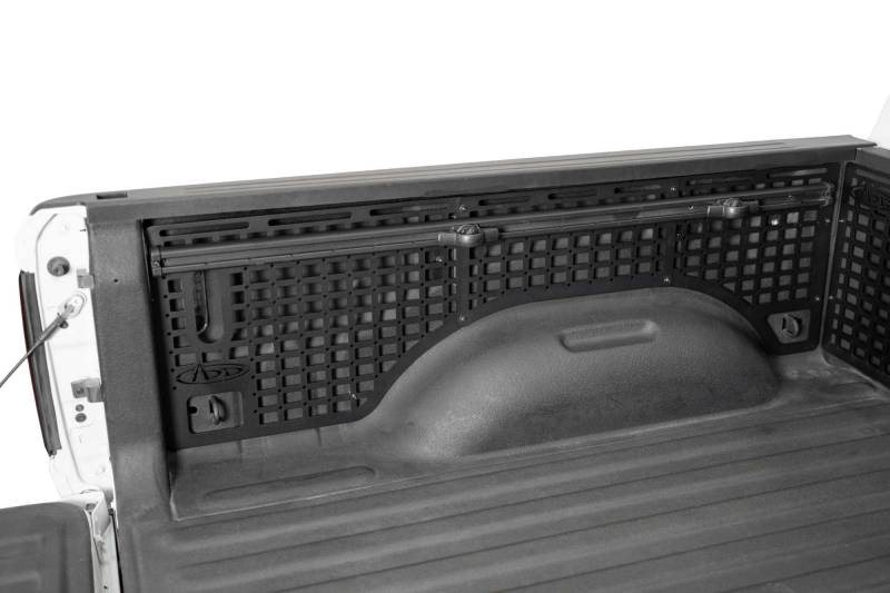 Constructed from American steel and finished in a durable 2-stage hammer black powder coat, these molle panels add secure storage for essentials like shovels, hi-lift jacks, fluid tanks, recovery gear, and more. The panels mount to the bed at several points, ensuring rigidity on rough terrain. Even so, they are easily removable when needed. As always, these are fully bolt-on and Made in America.\n** Please Note: Center panel cannot be installed on its own. It requires BOTH the front and rear panels for installation. The Center panel can be installed to both the Driver Side or Passenger Side of the bed.\nOur Bed Side Molle Panels optimize the cargo storage capabilities of your truck bed. Engineered for off-road durability and keeping your gear secure, these storage panels are compatible with various attachment systems. You can secure your gear to these panels with molle mounts, straps, bolts, or tie-down straps. Choose from several configurations for the driver side, passenger side, or both sides to maximize your vertical storage - and leave the bed floor clear for larger cargo. Our panels are unrivaled in their fitment and closely follow the contours of the truck bed.\nFront & Rear Bed Panels Only\nFront, Center, & Rear Bed Panels for Full Bed Length Coverage\n** Please Note: Only fits the 5.7 length bed.\nThis modular system allows for you to run 4 configurations on driver side, passenger side, or both:\nRear Bed Panel Only\nFront Bed Panel Only