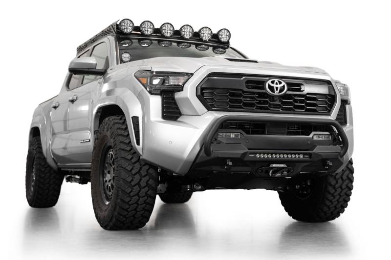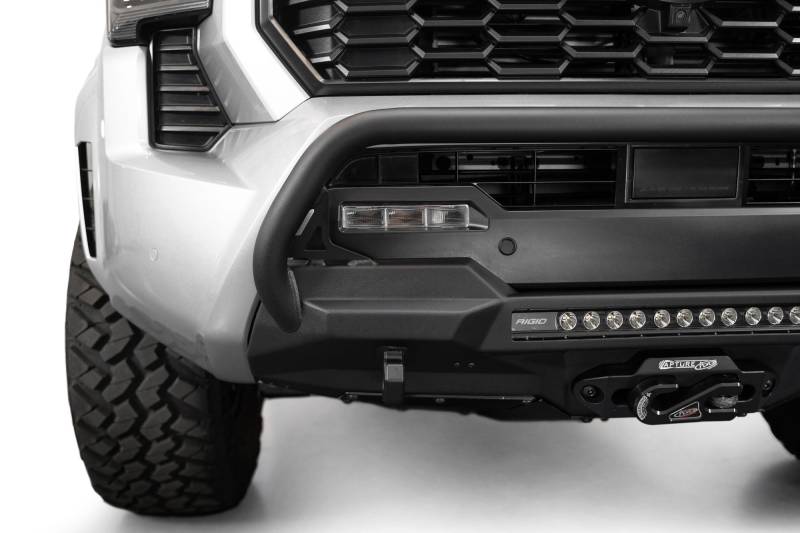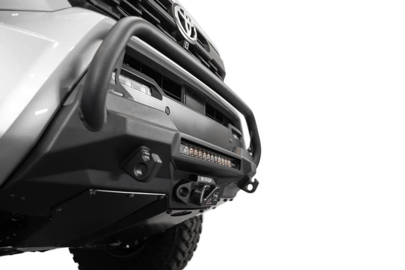 **Please Note: The bumper is not compatible with factory skid plates or the TRD Pro trim.\nAdaptive cruise control, sensors, fog lights, and the front camera are all compatible with the bumper. Finished with a hammer and satin black powder coat. Made in America.\n*Please Note: Installation is bolt-on with minimal non-visual cutting required.\nOur Stealth Winch Front Bumper features a top hoop and full recovery options. The bumper includes two D-ring mounts and a standard sized winch mount. Attach a 20-inch single row light bar to our universal center light mount.