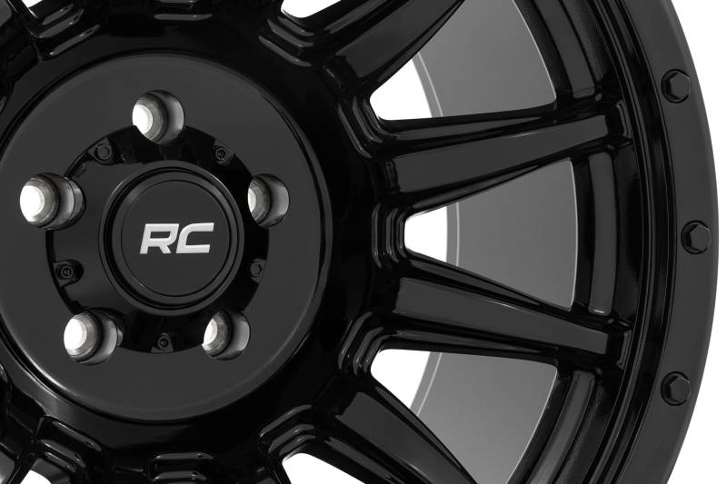 - Gloss Black Finish: Accented with black bolts for a bold, stealthy look.\ Distinctive 12-Spoke Design: Offers a sleek, aggressive style.\ Durable Single-Piece Aluminum: Super strong yet lightweight for enhanced performance and durability.\ Rough Country Center Cap: Features a black cap with silver lettering for added style.\ Warranty Protection: Backed by a 1-year finish warranty and Limited Lifetime Structural Warranty for peace of mind..