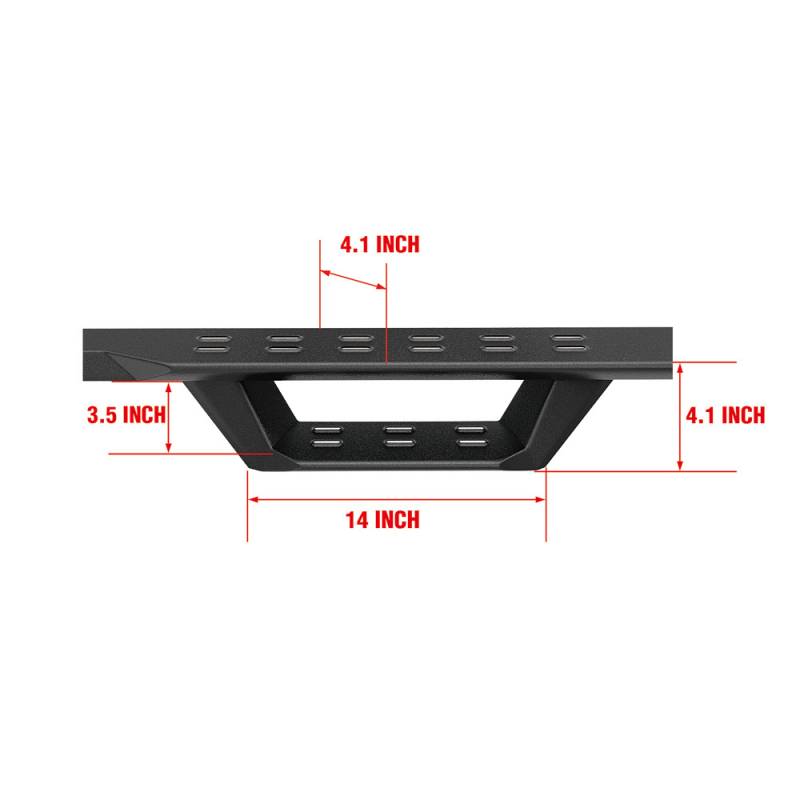 - The unique drop-down style nerf bar has an open wide step area (length: 14 inches; width: 4.1 inches; drop size:3.5 inches) and a non-slip step pad that provides safe and easy access into the vehicle.