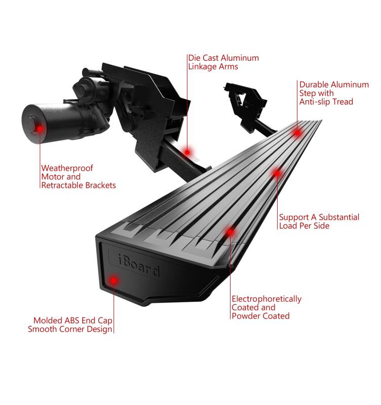 APS's Power Board is a full-length, automatically deployable running board designed for trucks and SUVs. The board provides a wider step area than traditional nerf bars, making it easier for passengers to enter and exit the vehicle. Made from high-quality carbon steel with die cast aluminum alloy linkage arms, and ABS end caps. This running board is durable and designed to wit'stand harsh weather conditions and heavy use. The sleek design also adds a sporty look to the vehicle.