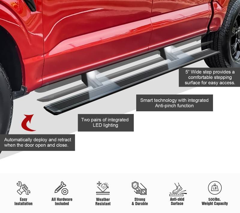 - The running board design (width: 5 inches) extends automatically when you open the vehicle door, providing an 11-inch drop from the doorsill for convenient entry or exit.
