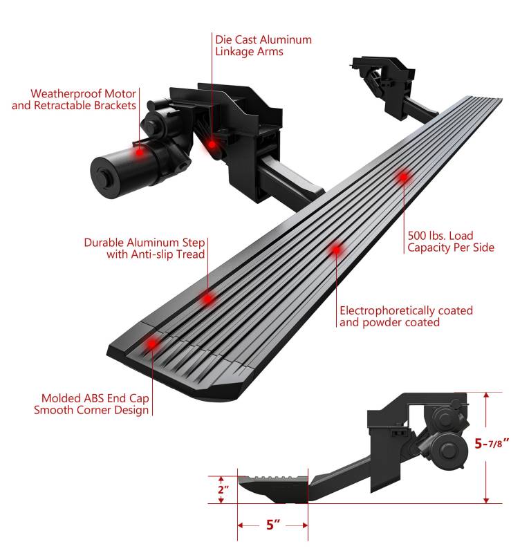 - The running board design (width: 5 inches) extends automatically when you open the vehicle door, providing an 11-inch drop from the doorsill for convenient entry or exit.