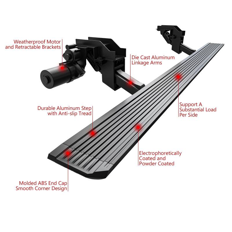 APS's Power Board is a full-length, automatically deployable running board designed for trucks and SUVs. The board provides a wider step area than traditional nerf bars, making it easier for passengers to enter and exit the vehicle. Made from high-quality carbon steel with die cast aluminum alloy linkage arms, and ABS end caps. This running board is durable and designed to withstand harsh weather conditions and heavy use. The sleek design also adds a sporty look to the vehicle.