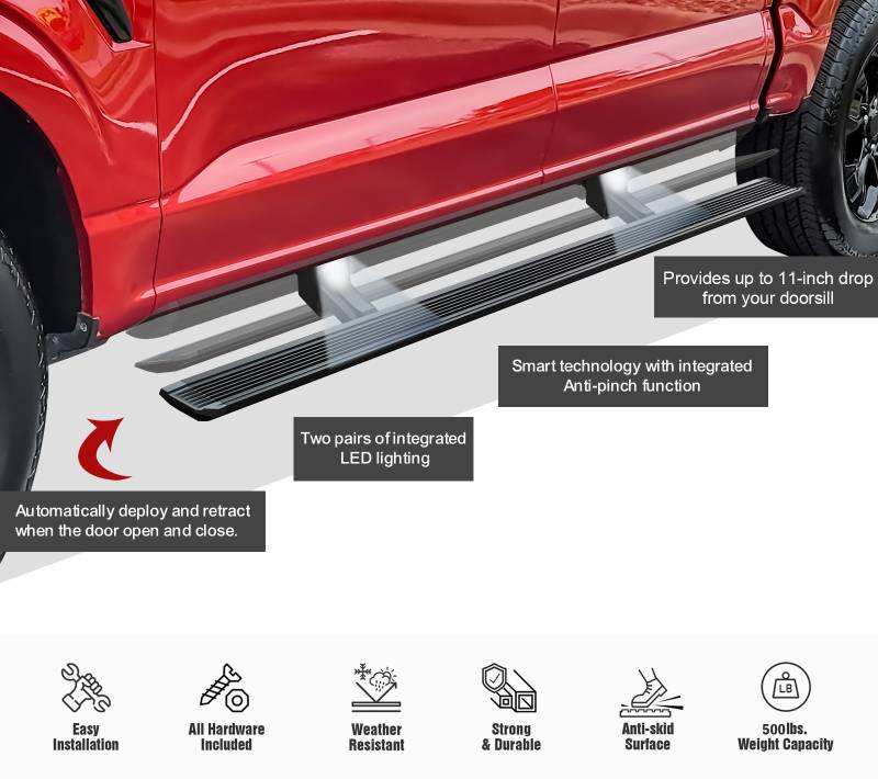 - The running board design (width: 5 inches) extends automatically when you open the vehicle door, providing an 11-inch drop from the doorsill for convenient entry or exit.