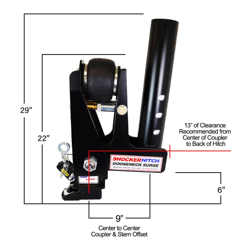 The revolutionary patented Shocker Gooseneck Surge Air Hitch with 9" offset coupler that is positioned 9" forward, which is great for use with gooseneck horse trailers being pulled by a short bed pickup when additional cab clearance is needed. The offset gooseneck extension coupler with built in air ride absorbs the bumps, bangs, chucking, jerks and tugs normally experienced when towing a gooseneck trailer and creates a much smoother and safer experience. Easier on you, your horse, equipment, cargo, pickup and your trailer. This offset gooseneck air hitch adapter is commonly used on horse trailers & race trailers pulled with a short bed truck. Design keeps your truck cab safe plus you get all the benefits of a gooseneck air hitch & coupler. This 30,000 lb gooseneck air hitch & coupler gives you smoother and safer towing by filtering the road jerks, bumps and bangs through the built in air spring bag and ultimately cushioning your towing experience. This takes the chucking you feel when towing a gooseneck away. This shock absorbing cushion hitch is the only air ride hitch to exclusively work in a forward and back motion, which is often times this is the biggest jerk you feel when towing a gooseneck trailer. The built in air ride system filters the road shock creating a smoother, safer towing experience for you, your pickup, your trailer & the contents. Featuring the patented & revolutionary 30K Shift Lock Couplers for 2-5/16" hitch balls. Upgrade your gooseneck trailer with the smooth towing solution that extends the coupler 9 inches forward.