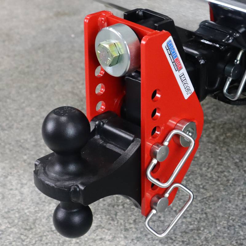 The Shocker Impact cushion hitch with adjustable combo ball mount is designed for heavy duty to cushion the towing experience and create a smooth ride. Great for contractors, boat owners, enclosed trailers, campers, car trailers and even motorhomes. The pivoting, shock absorbing dual bump cushioning design is heavy duty and can handle the rough roads and give you a smooth tow. The bumps and bangs and filtered through the double cushions and the unique flip around design, allows you to flip the entire hitch around for more drop or rise. The adjustable combo multi-ball mount has both a 2" hitch ball and a 2-5/16" hitch ball. This shocker absorbing combo hitch gives you 4" of rise to 4" of drop. Combo ball mount offers versatility for towing trailers with 2" or 2-5/16" ball couplers and features a safety red impact resistant textured durable powder coat finish. Shocker Impact cushioned hitch ball mount provides the ultimate in versatility and a smoother towing experience than a solid ball mount. The Impact ball mount has built in adjustability maximum versatility with 7 adjustment holes for your towing needs. Works great on work vans, adventure vans, motorhomes, rv’s, pickup trucks, full size vans, suvs, cuvs and minivans. 2 hitch pin holes to adjust the length and there is plenty of room on the receiver shank to accommodate hitch mounted towing mud flaps or shocker bumper tow flaps. Use this adjustable ball mount however you need to for tons of versatility. This Shocker Impact cushioned combo ball mount attaches by sliding into a standard receiver tube. 12,000 lbs tow rating capacity and 1,200 lbs tongue weight. Available with 2" or 2.5" receiver hitch shank.