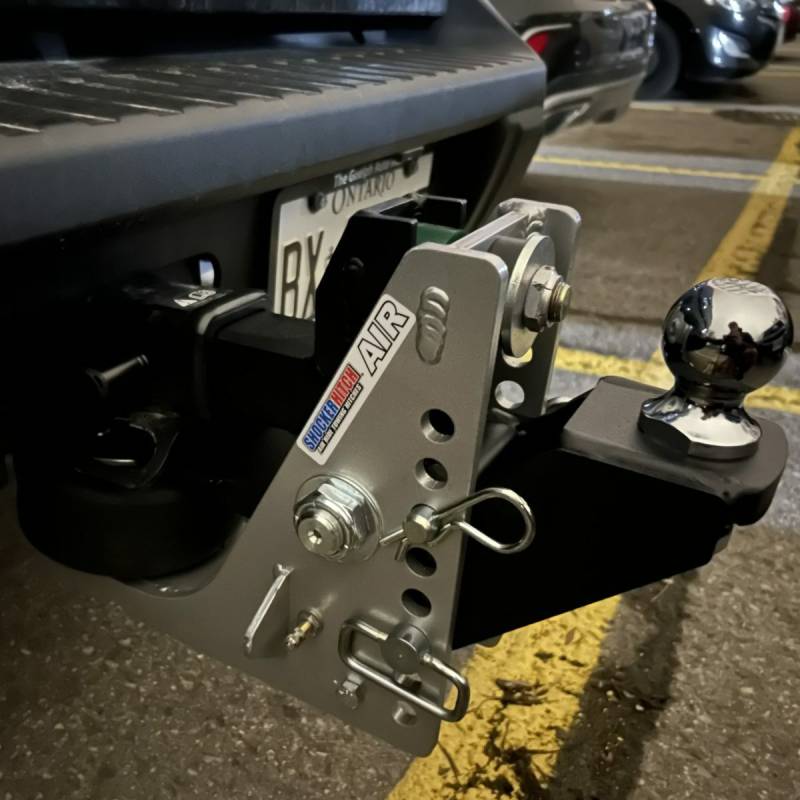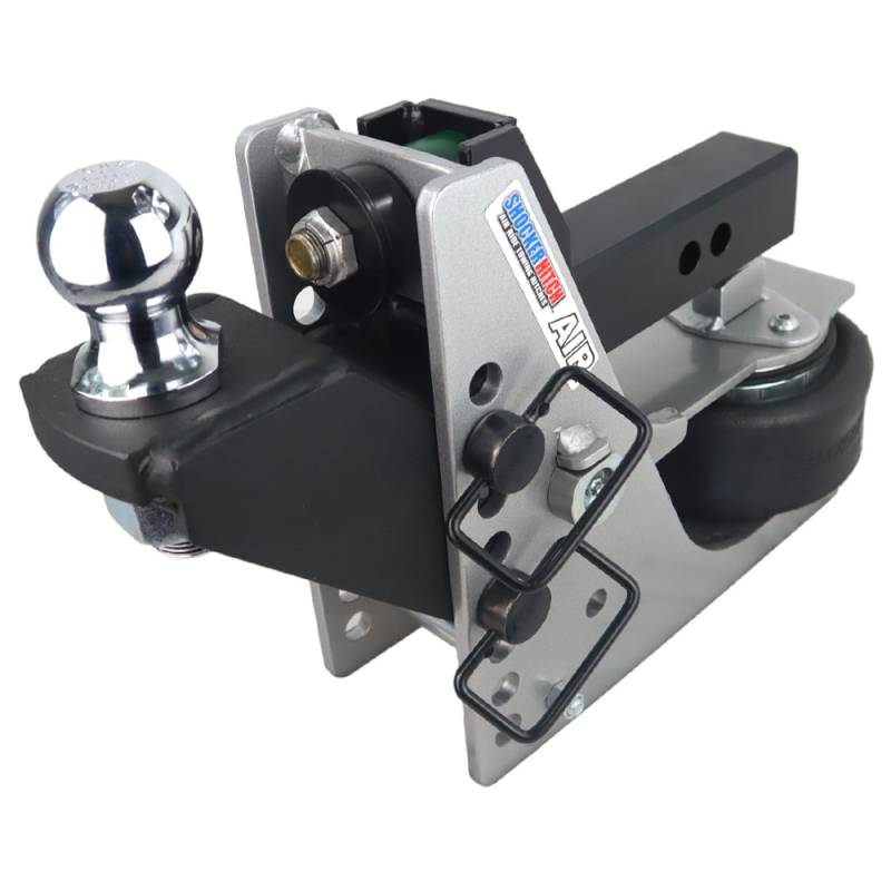 - Complete Aluminum Air Hitch Kit includes: Aluminum Shocker air receiver hitch base frame assembly with built-in airbag & dual bump cushions, ball mount you choose, and three D-handle black ball mount hitch pins.