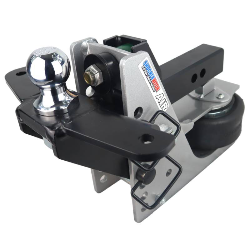 The revolutionary aluminum air hitch. The Shocker Streamline aluminum air hitch with a Raised Ball Mount with welded on sway control bar mounting tabs. This lightweight but strong 10K aluminum hitch with black powder-coat raised mount comes with either a 2" or 2-5/16" and features sway bar tabs for mounting basic friction sway arm bar kits such as the Shocker sway bar kit. This trailer towing setup is create for pulling campers and other trailer if you have trailer sway problems. The aluminum air ride hitch, absorbs the bumps, bangs and jerk experience while towing on concrete highways and rough roads. The built in air ride system naturally reduces the tendency of trailer sway and the sway bar mount tabs, when used with a friction sway bar kit really help create a safer and all around smoother towing experience. Get air-ride trailer towing in minutes. The aluminum hitch frame, 2" receiver shank, and paddle offer a rust-free design that will work, function and look great on your pickup truck or SUV for years to come. The Shocker 10k Aluminum Air Hitch includes everything you need including 2 D-handle ball mount attachment pins with clips along with the adjustable sway bar tab mount raised ball mount, which gives you 2" of rise to 2" of drop. If you are looking for other Ball Mount Attachments we offer a wide range including combo ball, drop, drawbar, pintle, pintle with ball, clevis along with sway bar options. The aluminum air hitch has a 10,000 lbs tow rating capacity and a 1,000 lbs tongue weight. The aluminum Shocker Air provides the ultimate smooth ride. This shock-absorbing hitch with air suspension is the best cushioning device on the earth. The Shocker Air is a miniature air suspension unit mounted between your truck and trailer. This Shocker mounts by sliding into a standard receiver tube. Fits Pickup Trucks, Vans, and Select SUV’s with the receiver hitch tube mounted underneath the bumper.