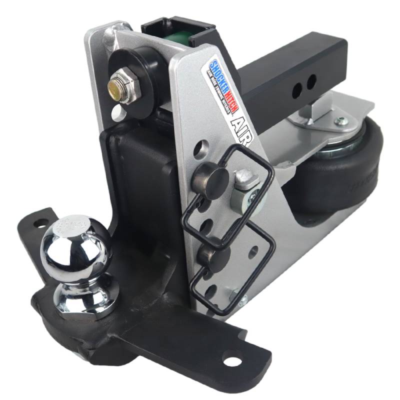 - Complete Aluminum Air Hitch Kit includes: Aluminum Shocker air receiver hitch base frame assembly with built-in airbag & dual bump cushions, Drop mount with sway tabs and 2" or 2-5/16" ball along with three D-handle black ball mount hitch pins.