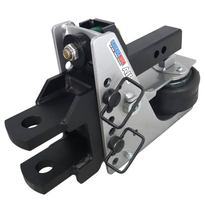- Complete Aluminum Air Hitch Kit includes: Aluminum Shocker air receiver hitch base frame assembly with built-in air ride system & dual bump cushions, adjustable Clevis pin mount and three D-handle ball mount attachment pins with clips.