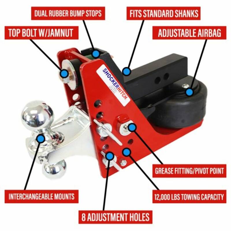 The Shocker Air Ride Receiver Hitch with a raised ball mount comes with a 2" or 2-5/16" chrome hitch ball with 2" of rise to 2" drop. 12,000 lbs tow rating capacity and 1,200 lbs tongue weight. Shocker air provides the ultimate smooth ride and the raised ball mount is often used with camper towing when your camper trailer has a higher tongue. Works great for pulling a camper, ice houses, equipment & cargo trailers and more. The Shocker Air is a miniature air suspension unit mounted between your pickup truck and trailer. This Shock absorbing trailer hitch mounts by sliding into a standard receiver tube. The pivoting design, filters the bumps and bangs through the built in air ride system, creating a way smoother and safer trailer towing experience. Plus it saves you money by reducing trailer breakage on both the trailer and the trailer contents! The Shocker hitch absorbs the damaging forces experienced with a typical hard connection. This greatly reduces the chances of breaking welds and doing other long term damage to your equipment as well as the valuable cargo you have inside the truck and trailer. The Shocker air with standard ball mount is great for pickups trucks, vans and select SUV’s where the receiver tube is under the bumper. This shock absorbing hitch is a must have for smoother trailer towing. The built in air spring bag lasts for years and does a wonderful job of smoothing out your towing experience by cushioning both your tow vehicle and the trailer. The air ride system sits under the receiver tube allowing a short distance of 10-inches between mounting pin and ball center. You will find the advantage of the Air Shocker is your ability to adjust air pressure for best ride and load control. Plus the drop range is great for stock pickup trucks. Shocker air bumper hitch offers a shock dampening action & effectively absorbs the jerking, tugging and damaging forces experienced with a typical hard connection when towing trailers. There is no reason to beat yourself or your equipment up with a hard connection between your trailer and your receiver hitch.
