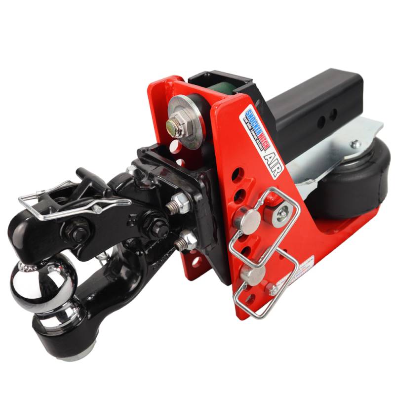 Get everything you need to tow multiple trailers with the Shocker Air hitch and combination pintle hook with ball mount. This Air ride towing hitch comes with an 8-ton combination pintle hook mount with a 2" or 2-5/16" forged hitch ball. Eliminate having to always switch around mounts for different trailers. This combo pintle hook ball mount allows you to easily switch between a trailer ball to a pintle hook in a matter of seconds. The Shocker Air Pintle Receiver Hitch with combo pintle ball that has 8 Adjustment holes for an adjustable height of 1" Drop to 6" Drop. The adjustable pintle design allows you to unbolt from the mounting plate and flip for additional rise or drop. The pintle hook and ball comes in handy for pulling trailers with pintle ring or a ball coupler. Choose between a 12,000 lbs tow rating capacity and 1,200 lbs tongue weight or a 20,000 lbs tow rating capacity and 2,000 lbs tongue weight with the Shocker HD. Shocker air provides the ultimate smooth ride. The Shocker Air is a miniature air suspension unit mounted between your truck and trailer. This Shocker mounts by sliding into a standard receiver tube. This pintle hook fits 6" OD x 3" ID pintle rings. Works great on pickup trucks, vans, and select SUV’s with receiver tube below the bumper. This military-style air ride hitch comes in handy for pintle hitch trailer lowing. The air ride system sits under the receiver tube allowing a short distance of 10-inches between mounting pin and ball center. You will find the advantage of the combo pintle ball Air Shocker is your ability to adjust air pressure for best ride and load control. This adjustable pintle has a nice fix because of the design reducing slop and the built in air ride smooths out your towing. Fits standard 2" receiver tube, 2-1/2" and 3" receivers. Often used on farm applications, contractor trailers, equipment & dump trailers and off-road trailers.