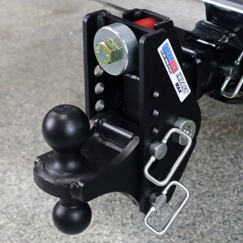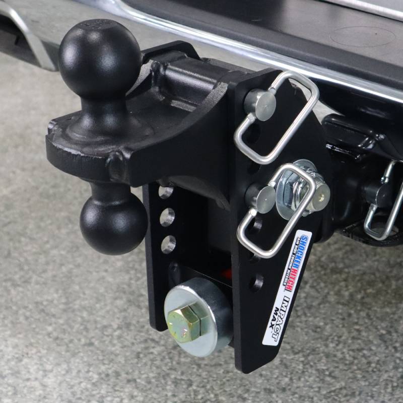 The Shocker Impact Max black cushioned hitch combo dual ball mount is designed to cushion the towing experience and handle the road shock. This shock-absorbing cushion hitch ball mount is often considered the ideal hitch for boat towing, contractor trailers and camper trailers. It cushions your towing experience with the built-in dual bump cushions, absorbing both the up/down & forward/backward jerks and tugs you experience towing creating a smoother towing experience. It built heavy-duty. The Impact max comes with impact resistant super durable textured matte black powder coated finish on the base frame for long-lasting life and sleek finish. The 20k dual bump cushion design is rated up to 20,000 lbs. Pivoting built-in dual bump cushion design takes the bangs and bumps out of your trailer towing. Featuring a combo multi-ball mount with both a 2" hitch ball and a 2-5/16" hitch ball with 7 adjustment holes for 7" of adjustment giving you 4" of rise to 4" of drop. Shocker Impact Max cushioned hitch ball mount provides the ultimate in versatility and a smoother towing experience than a solid ball mount. Ideal for absorbing the road shock when you are towing anything from 2,500 lb to 20,000 lb GTW trailers; skid steer, dump, racing trailers, equipment, boat, snowmobile, fishhouse, campers military and more. The Impact Max cushion style ball mount has built in adjustment for maximum versatility with 7 adjustment holes for your towing needs. This Shocker Impact cushioned combo ball mount attaches by sliding into a standard receiver tube. Use this adjustable cushioned ball mount however you need to for tons of versatility. 20,000 lbs tow rating capacity and 2,000 lbs tongue weight. Since it has 2 hitch pin holes, it also works with hitch mounted towing mud flaps.