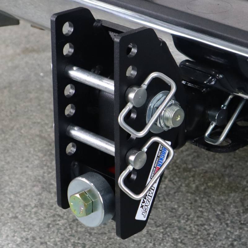- Includes complete adjustable Shocker Impact Max cushioned hitch with built in bump cushions & 2 d-handle ball mount attachment pins with clips. (No ball mount – ball mount attachments sold separately)