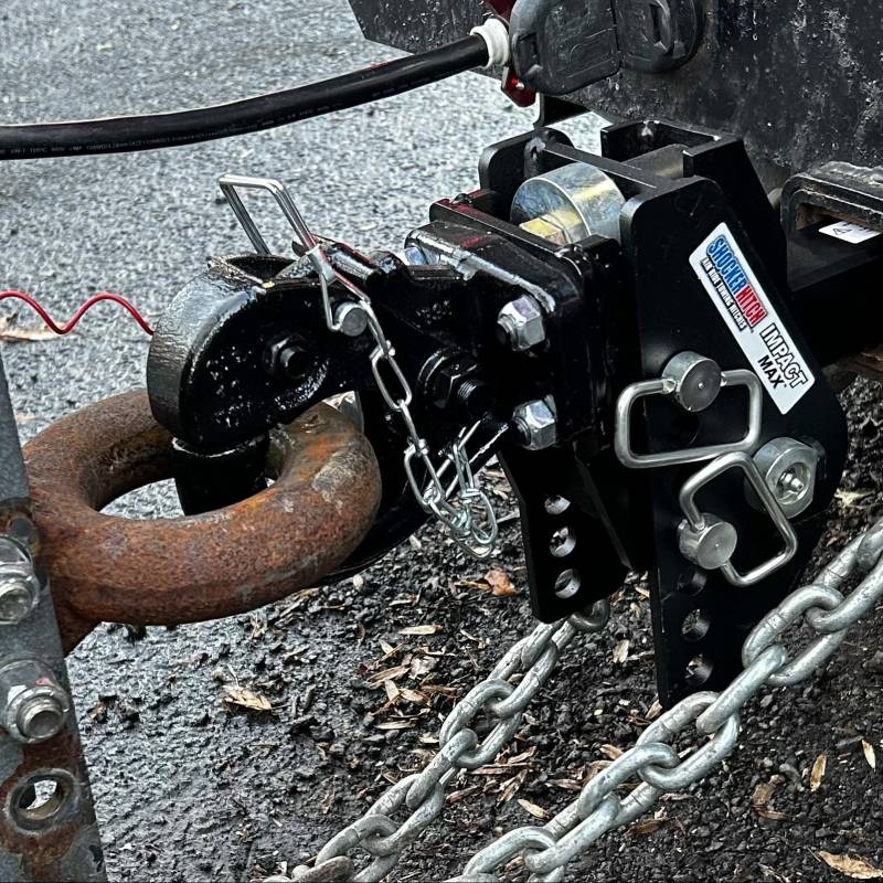 This 20K heavy-duty adjustable, dual cushion shock absorbing adjustable pintle hitch is great for farm, contractor and heavy duty trailer towing applications. The cushion hitch features a shock absorbing pivoting design that absorbs the bumps, bangs, jerks and tugs normally experienced when towing trailers with a pintle ring and creates smoother trailer towing. It’s idea on pickups pulling dump, skid steer, equipment and military trailers with a pintle ring on the front. Featuring over 10 inches of adjustment. Adjustable pintle hook has either 1" Rise to 6-1/2" drop or 4" Rise to 6-1/2" Drop. The all black Shocker Impact Max cushioning pintle hook ball mount is designed to absorb road shock and cushion your trailer towing experience. This hitch can be flipped around for more drop or rise. The dual bump cushion design pintle hitch is rated up to 20,000 lbs towing and 2,000 lbs tongue weight and also includes a 10-ton pintle hook. Featuring a heavy-duty pintle hook to fit a 6" OD x 3" ID pintle ring. Plus the shocker pintle hook hitch is designed and made for a nice, tight fit with your pintle ring. This Impact Max cushioned pintle hitch ball mount attaches to your truck by sliding into a standard receiver tube. Available for 2", 2-1/2" or 3" receiver. Use this adjustable pintle hitch ball mount however you need to for tons of versatility. This military style HD towing hitch is great for contractors pulling skid steer, dump and tilt trailers, around the farm and off-road overland towing as well as other heavy-duty trailer towing applications. Built-in dual bump cushions, absorbing both the up or down & forward or backward jerks and tugs you experience towing creating a smoother towing experience.