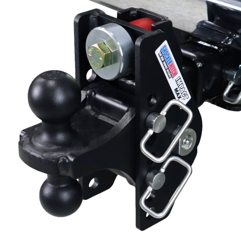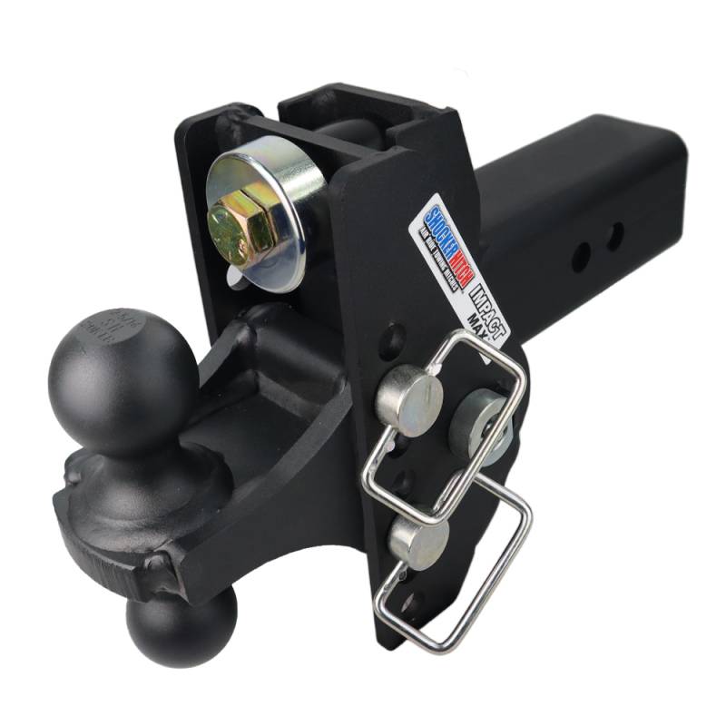 The Shocker Impact Max black cushioned hitch combo dual ball mount is designed to cushion the towing experience and handle the road shock. This shock-absorbing cushion hitch ball mount is often considered the ideal hitch for boat towing, contractor trailers and camper trailers. It cushions your towing experience with the built-in dual bump cushions, absorbing both the up/down & forward/backward jerks and tugs you experience towing creating a smoother towing experience. It built heavy-duty. The Impact max comes with impact resistant super durable textured matte black powder coated finish on the base frame for long-lasting life and sleek finish. The 20k dual bump cushion design is rated up to 20,000 lbs. Pivoting built-in dual bump cushion design takes the bangs and bumps out of your trailer towing. Featuring a combo multi-ball mount with both a 2" hitch ball and a 2-5/16" hitch ball with 7 adjustment holes for 7" of adjustment giving you 4" of rise to 4" of drop. Shocker Impact Max cushioned hitch ball mount provides the ultimate in versatility and a smoother towing experience than a solid ball mount. Ideal for absorbing the road shock when you are towing anything from 2,500 lb to 20,000 lb GTW trailers; skid steer, dump, racing trailers, equipment, boat, snowmobile, fishhouse, campers military and more. The Impact Max cushion style ball mount has built in adjustment for maximum versatility with 7 adjustment holes for your towing needs. This Shocker Impact cushioned combo ball mount attaches by sliding into a standard receiver tube. Use this adjustable cushioned ball mount however you need to for tons of versatility. 20,000 lbs tow rating capacity and 2,000 lbs tongue weight. Since it has 2 hitch pin holes, it also works with hitch mounted towing mud flaps.