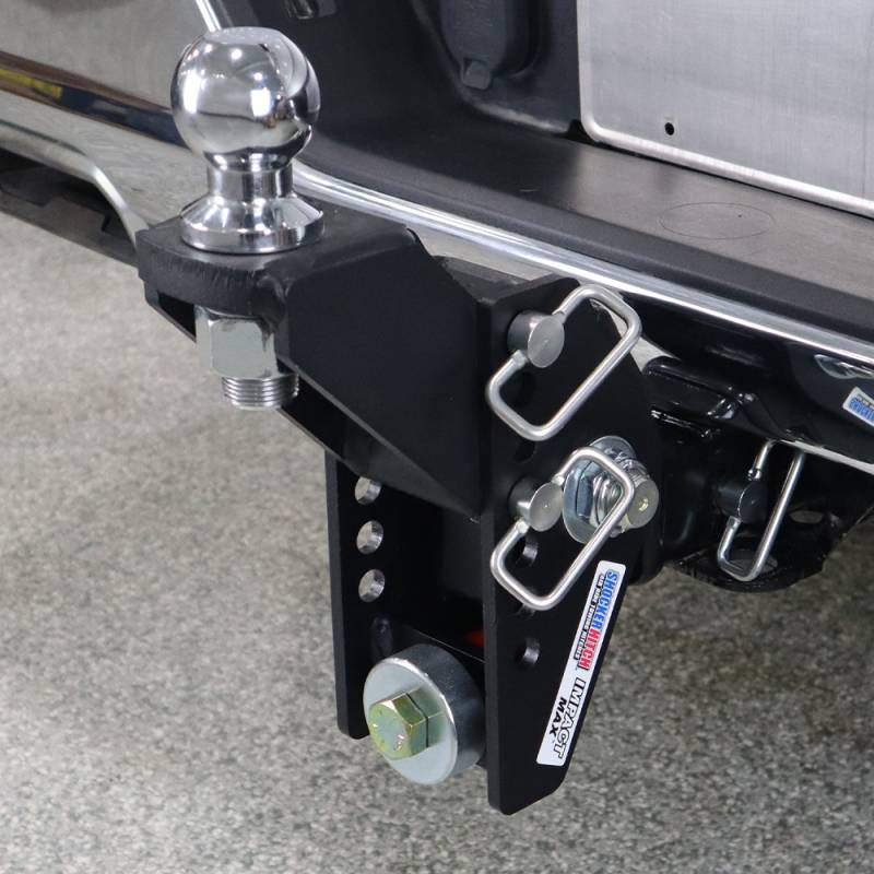 The adjustable 20K Shocker Impact Max black cushion hitch with raised ball mount comes with either a 2" or 2-5/16" hitch ball. This shock absorbing dual cushioning hitch is designed for towing campers, boats, contractor equipment trailers, fish houses, skid steer trailers and more. The Impact max comes with impact resistant super durable textured matte black powder coated finish on the base frame for long-lasting life and sleek finish. This HD cushion hitch greatly reduces the road shock you feel with a solid ball mount and it cushions your towing. The dual action bump cushion hitch is rated for up to 20,000 lbs. Featuring 5" of rise to 3" of drop. It has a total capacity of 20,000 lbs tow rating capacity and 2,000 lbs tongue weight. Impact cushion hitches work great on pickup trucks, vans, suvs, cuvs and minivans. This is also the perfect cushioned ball mount for an RV or motorhome to reduce the bouncing in the back your motorhome. The Shocker Impact Max ball mount hitch has built in adjustability with 7 adjustment holes for your all towing needs. Plus the receiver shank has 2 holes for the hitch pin so you can adjust the length and it also works with hitch mounted mud flaps. The receiver shank has 2 hitch pin holes for adjustability but it will work with hitch mud towing mud flaps or with the Shocker Hitch Tow Flap system.