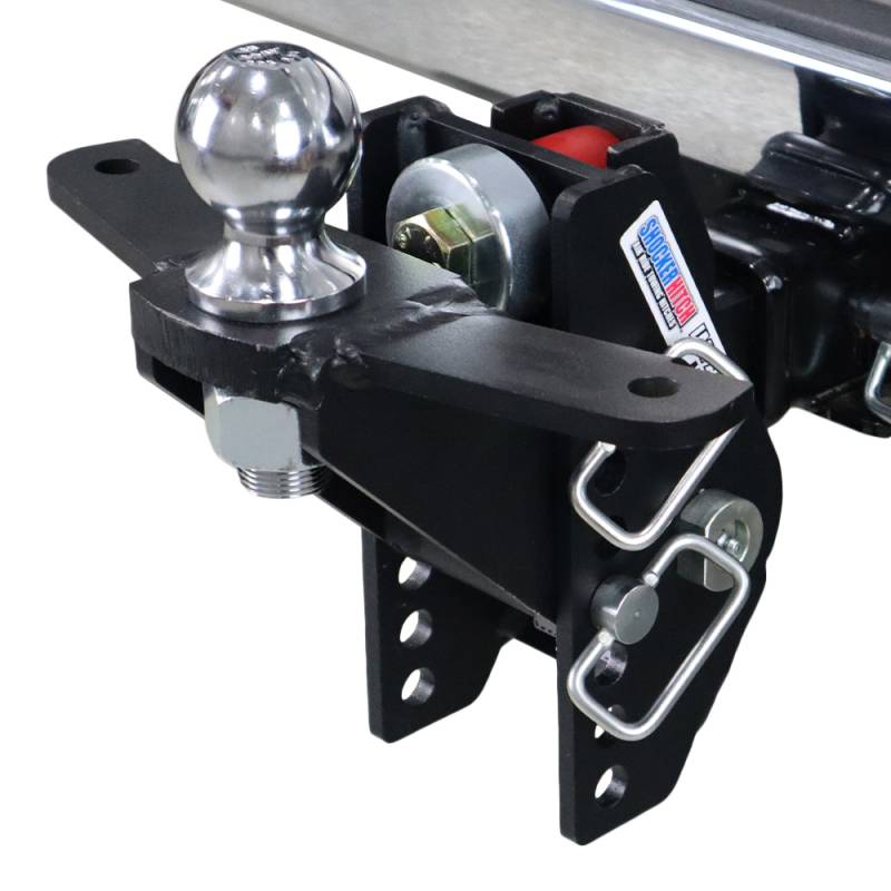 - Includes complete adjustable Shocker Impact Max cushioned base frame with built-in bump cushions, adjustable raised ball mount with sway tabs & 2 d-handle ball mount pins with clips.