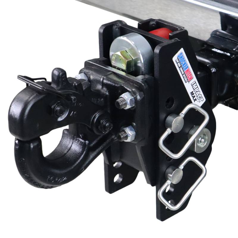 This 20K heavy-duty adjustable, dual cushion shock absorbing adjustable pintle hitch is great for farm, contractor and heavy duty trailer towing applications. The cushion hitch features a shock absorbing pivoting design that absorbs the bumps, bangs, jerks and tugs normally experienced when towing trailers with a pintle ring and creates smoother trailer towing. It’s idea on pickups pulling dump, skid steer, equipment and military trailers with a pintle ring on the front. Featuring over 10 inches of adjustment. Adjustable pintle hook has either 1" Rise to 6-1/2" drop or 4" Rise to 6-1/2" Drop. The all black Shocker Impact Max cushioning pintle hook ball mount is designed to absorb road shock and cushion your trailer towing experience. This hitch can be flipped around for more drop or rise. The dual bump cushion design pintle hitch is rated up to 20,000 lbs towing and 2,000 lbs tongue weight and also includes a 10-ton pintle hook. Featuring a heavy-duty pintle hook to fit a 6" OD x 3" ID pintle ring. Plus the shocker pintle hook hitch is designed and made for a nice, tight fit with your pintle ring. This Impact Max cushioned pintle hitch ball mount attaches to your truck by sliding into a standard receiver tube. Available for 2", 2-1/2" or 3" receiver. Use this adjustable pintle hitch ball mount however you need to for tons of versatility. This military style HD towing hitch is great for contractors pulling skid steer, dump and tilt trailers, around the farm and off-road overland towing as well as other heavy-duty trailer towing applications. Built-in dual bump cushions, absorbing both the up or down & forward or backward jerks and tugs you experience towing creating a smoother towing experience.