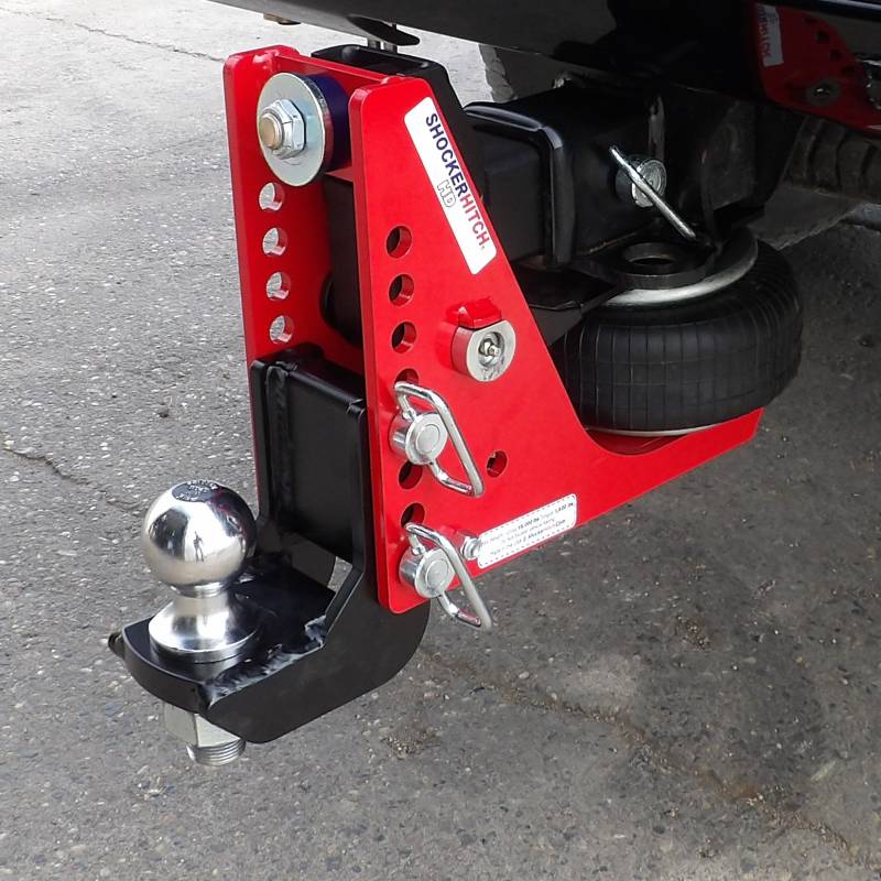 Add instant air ride to your pickup truck and trailer with this heavy-duty air ride bumper drop hitch. This heavy-duty drop hitch is great for taller pickup trucks. The Shocker HD 20K Air Receiver Hitch with adjustable drop ball mount comes with a 2" or 2-5/16" hitch ball with a 4-1/2" to 8-1/2" Drop. This Shocker HD air drop hitch & ball mount has 20,000 lbs tow rating capacity and 2,000 lbs tongue weight. Shocker HD air receiver drop hitch system provides the ultimate smooth ride with air ride technology with the built in heavy-duty air ride system. The HD air ride system is built in to cushion the ride and absorb the road shock taking the bangs, bumper and jerks out of your towing experience. The Shocker HD Air drop hitch is a miniature air suspension unit mounted between your truck and trailer. This Shocker mounts by sliding into a standard receiver tube. The Shocker air with drop ball mount is great for taller pickup trucks. Works great on pickup trucks, vans and select SUV’s with the receiver tube below the bumper. The HD air ride suspension system sits under the receiver tube allowing a short distance of 10-inches between mounting pin and ball center. You will find the advantage of the HD Air Shocker is your ability to adjust air pressure for best ride and load control. Plus the drop range is great for higher than stock pickup trucks. Fits standard 2" receiver tube, 2 1/2" and 3" receivers. The HD shocker is made for heavy-duty towing. Great for contractors, motor homes & horse trailers, big boats, tilt trailers, skid steer trailers, race trailers and more. No more jarring every time you cross a section divider. Your Shocker air hitch absorbs the thumps and bumps. By reducing trailer breakage on both the trailer and the trailer contents! The Shocker hitch absorbs the damaging forces experienced with a typical hard connection. This greatly reduces the chances of breaking welds and doing other long term damage to your equipment as well as the valuable cargo you have inside the truck and trailer.