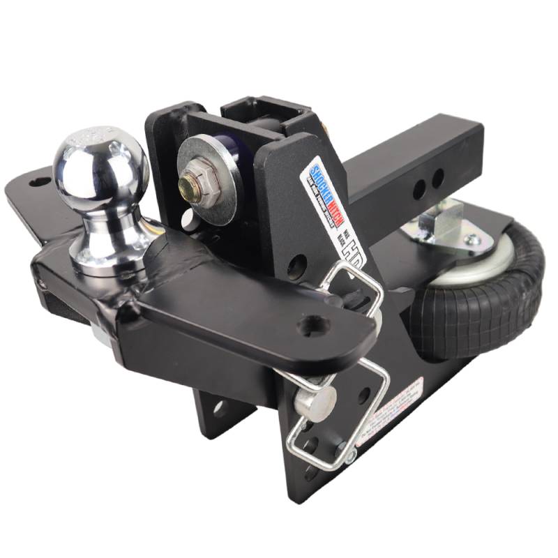 - Complete Kit Includes: Shocker HD Max Black receiver hitch base frame assembly with built in 20K air ride & dual bump cushions, ball mount you choose and three d-handle mount attachment pins with clips.
