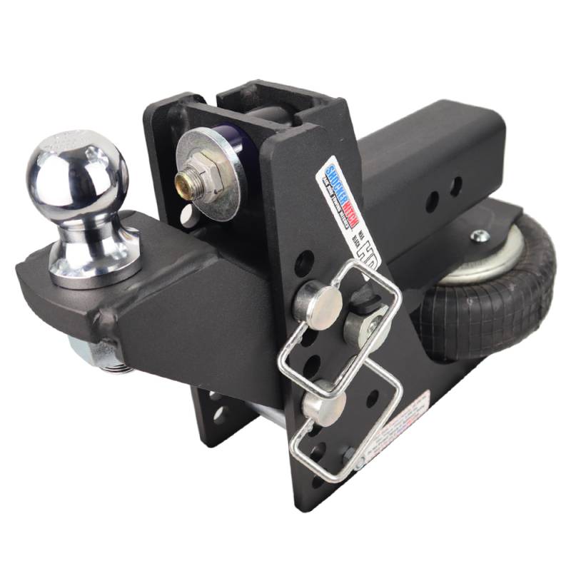 The Shocker HD Max Black Air Receiver Hitch with a raised ball mount is great for camper towing. It comes with a 2" or 2-5/16" hitch ball and features 8" adjustment holes for 2" of rise to 2" drop. The impact resistant textured matte black finish looks great and the Heavy duty air suspension hitch is rated for 20,000 lbs trailer tow rating capacity and 2,000 lbs tongue weight. Add air ride towing to your setup in minutes. Shocker HD air provides the ultimate smooth ride. The Shocker HD Air is a miniature air suspension unit mounted between your pickup truck and trailer. Built in heavy-duty air ride directs road shock, bumps, tugs and bangs through air ride system, cushioning the towing and making your towing experience safer & smoother for you, your truck, trailer and its’ contents. The shock absorbing design naturally reduces the tendency of trailer sway. The raised hitch option is commonly used pulling campers with higher trailer tongues. This Heavy-duty shock absorbing trailer hitch mounts by sliding into a standard receiver tube. This shock absorbing hitch is a must have for smoother trailer towing. The included raised ball mount is black powdered coated with a bolted on chrome hitch ball for maximum strength. Great for pickup trucks, vans and select Motorhomes & SUV’s where the receiver hitch tube is under the bumper. HD Max Black Shocker air hitch offers shock dampening action by effectively absorbing the jerking, tugging and damaging forces experienced with a typical hard connection when towing trailers. There is no reason to beat yourself or your equipment up with a hard connection between your trailer and your receiver hitch. Plus get provides comfort with a smoother ride! Travel a lot on concrete highways? No more jarring every time you cross a section divider. Your Shocker air hitch absorbs the thumps and bumps. By reducing trailer breakage on both the trailer and the trailer contents its saving you money! The Shocker Max Black HD air ride receiver hitch absorbs the damaging forces experienced with a typical hard connection. This greatly reduces the chances of breaking welds and doing other long term damage to your equipment as well as the valuable cargo you have inside the truck and trailer. The 20k HD air ride system sits under the receiver tube allowing a short distance of 10-inches between mounting pin and ball center. You will find the advantage of the HD Air Shocker is your ability to adjust air pressure for best ride and load control. Plus the drop range is great for stock pickup trucks. Fits standard 2", 2-1/2" & 3" receivers.