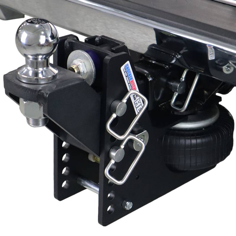 - Kit includes complete Shocker Max Black HD air receiver hitch with built in 20K air ride system & dual bump cushions, adjustable raised ball mount with 2" or 2-5/16" chrome hitch ball & three d-handle ball mount hitch pins.