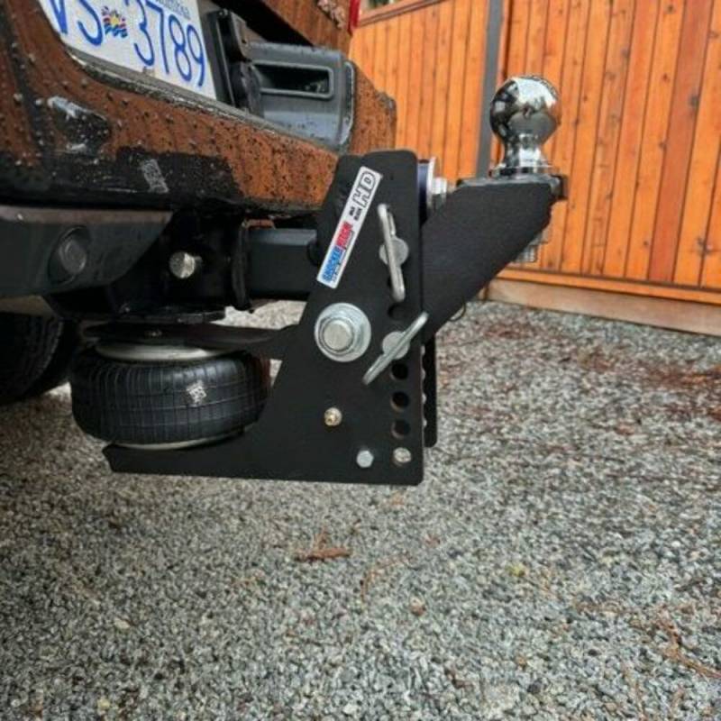 The Shocker HD Max Black Air Receiver Hitch with a raised ball mount is great for camper towing. It comes with a 2" or 2-5/16" hitch ball and features 8" adjustment holes for 2" of rise to 2" drop. The impact resistant textured matte black finish looks great and the Heavy duty air suspension hitch is rated for 20,000 lbs trailer tow rating capacity and 2,000 lbs tongue weight. Add air ride towing to your setup in minutes. Shocker HD air provides the ultimate smooth ride. The Shocker HD Air is a miniature air suspension unit mounted between your pickup truck and trailer. Built in heavy-duty air ride directs road shock, bumps, tugs and bangs through air ride system, cushioning the towing and making your towing experience safer & smoother for you, your truck, trailer and its’ contents. The shock absorbing design naturally reduces the tendency of trailer sway. The raised hitch option is commonly used pulling campers with higher trailer tongues. This Heavy-duty shock absorbing trailer hitch mounts by sliding into a standard receiver tube. This shock absorbing hitch is a must have for smoother trailer towing. The included raised ball mount is black powdered coated with a bolted on chrome hitch ball for maximum strength. Great for pickup trucks, vans and select Motorhomes & SUV’s where the receiver hitch tube is under the bumper. HD Max Black Shocker air hitch offers shock dampening action by effectively absorbing the jerking, tugging and damaging forces experienced with a typical hard connection when towing trailers. There is no reason to beat yourself or your equipment up with a hard connection between your trailer and your receiver hitch. Plus get provides comfort with a smoother ride! Travel a lot on concrete highways? No more jarring every time you cross a section divider. Your Shocker air hitch absorbs the thumps and bumps. By reducing trailer breakage on both the trailer and the trailer contents its saving you money! The Shocker Max Black HD air ride receiver hitch absorbs the damaging forces experienced with a typical hard connection. This greatly reduces the chances of breaking welds and doing other long term damage to your equipment as well as the valuable cargo you have inside the truck and trailer. The 20k HD air ride system sits under the receiver tube allowing a short distance of 10-inches between mounting pin and ball center. You will find the advantage of the HD Air Shocker is your ability to adjust air pressure for best ride and load control. Plus the drop range is great for stock pickup trucks. Fits standard 2", 2-1/2" & 3" receivers.