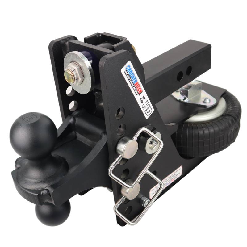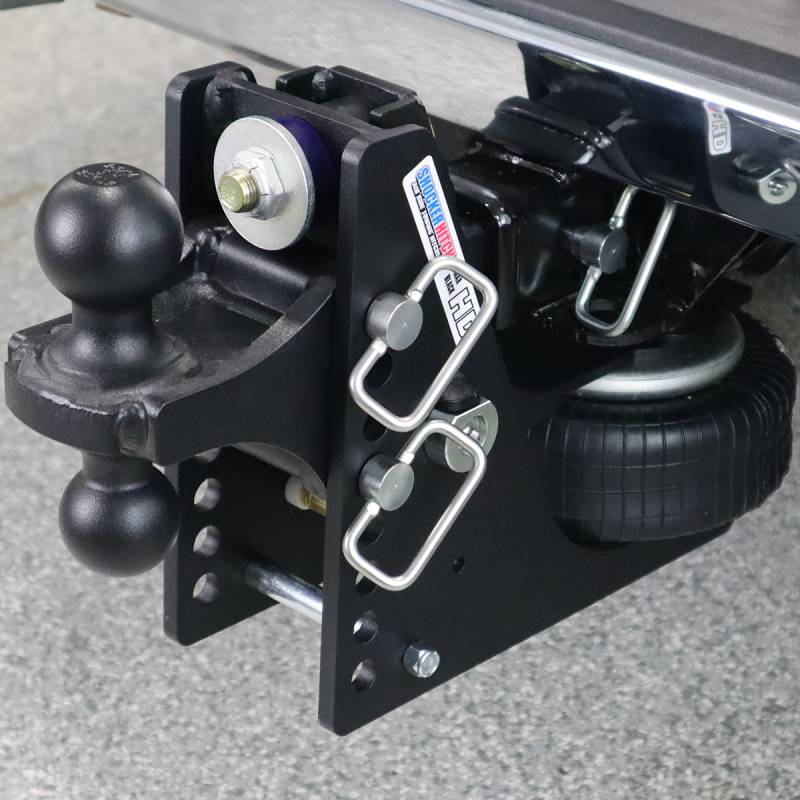 - Complete Air Ride Hitch Kit Includes: Shocker HD Max Black air receiver hitch with built in 20K air ride & dual bump cushions, combo ball mount attachment with 2" & 2-5/16" hitch balls that you choose and three d-handle mount attachment pins with clips.