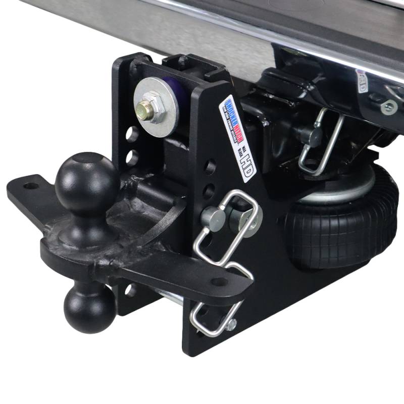 - Comes complete with Shocker 20K Max HD air receiver hitch with built in HD air ride system, adjustable silver or black combo dual ball mount (2" & 2-5/16" balls) with sway bar mount tabs and three d-handle ball mount attachment pins with clips. Sway control friction bar assembly sold separately.