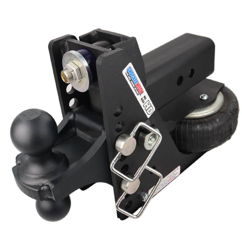 The Shocker HD Max Black Air Receiver Hitch with combo multi-ball mount adds instant air ride your your tow vehicle and trailer and comes with the all-new matte black premium powder-coat finish. This Max Black bumper mount air hitch from Shocker Hitch has both a 2" hitch ball and a 2-5/16" hitch ball with a 1/2" to 4-1/2" Drop. Instantly add air ride towing for your pickup and trailer. This 20K heavy-duty shock absorbing hitch & ball mount cushions the ride and takes the bumps and bangs out of towing. Shocker heavy-duty bumper-style air hitch provides the ultimate smooth ride when you’re towing and allows you to fine-tune your trailer towing experience base on the weight you are pulling. The Shocker Air is a heavy-duty air suspension towing hitch mounted between your truck and trailer. The built in heavy-duty air ride receiver system absorbs the road shock, bumps, bangs, jerks, tugs and sways, reducing the tendency of trailer sway and cushions your ride. The built in dual bump cushions also taken bangs and bumps of the road for additional extra duty performance. The heavy duty Shocker air ride hitch effectively absorbs the jerking, tugging and damaging forces experienced with a typical hard connection when towing trailers. There is no reason to beat yourself or your equipment up with a hard connection between your trailer and your receiver hitch. Upgrade to smooth, safer towing. This air hitch cushions the ride for you, your trailer and the trailer contents. Great for all around heavy-duty bumper hitch towing. 20,000 lbs tow rating capacity and 2,000 lbs tongue weight. The combo ball mount features combo balls for versatility and comes in a textured silver, matte black or red powder coat finish. Save money too by reducing wear and tear on driveline and frame! Treat yourself, your equipment, and your passengers to a much smoother ride. You’ll never go back to the ‘old days’ of continual bumps, jerks, and vibrations. Join the list of satisfied customers that are using Shocker HD max black air bumper hitches. Get ready for your ultimate smooth towing experience the next time out. This Shock absorbing air ride cushion hitch mounts by sliding into a standard receiver tube. Made for pickup trucks. Also works with vans and select SUVs with the receiver tube underneath the bumper. The 20K air ride trailer towing system sits under the receiver tube allowing a short distance of 10-inches between mounting pin and ball center. You will find the advantage of the Air Shocker is your ability to adjust air pressure for best ride and load control. The Shocker HD is 20,000 lbs towing capacity and 2,000 lbs on tongue weight.