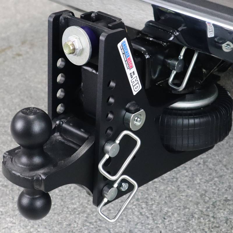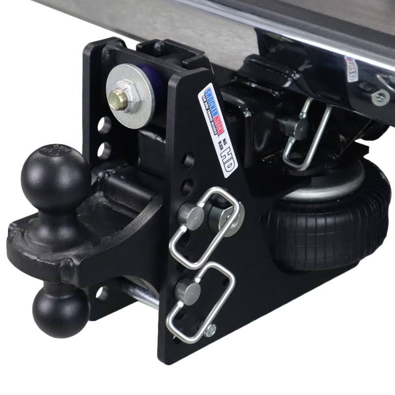 - Complete Air Ride Hitch Kit Includes: Shocker HD Max Black air receiver hitch with built in 20K air ride & dual bump cushions, combo ball mount attachment with 2" & 2-5/16" hitch balls that you choose and three d-handle mount attachment pins with clips.