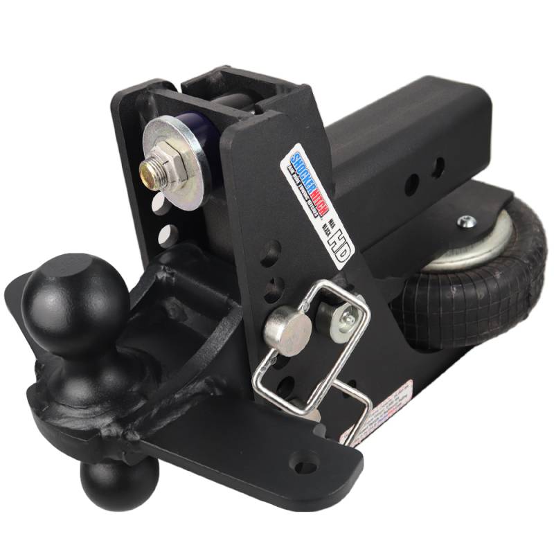 - Comes complete with Shocker 20K Max HD air receiver hitch with built in HD air ride system, adjustable silver or black combo dual ball mount (2" & 2-5/16" balls) with sway bar mount tabs and three d-handle ball mount attachment pins with clips. Sway control friction bar assembly sold separately.