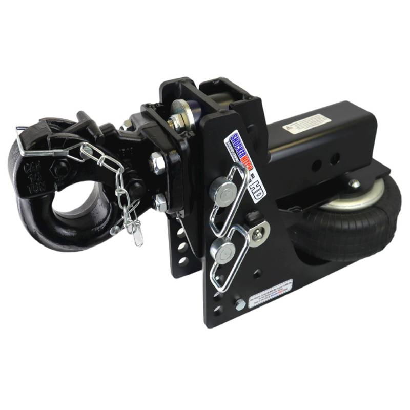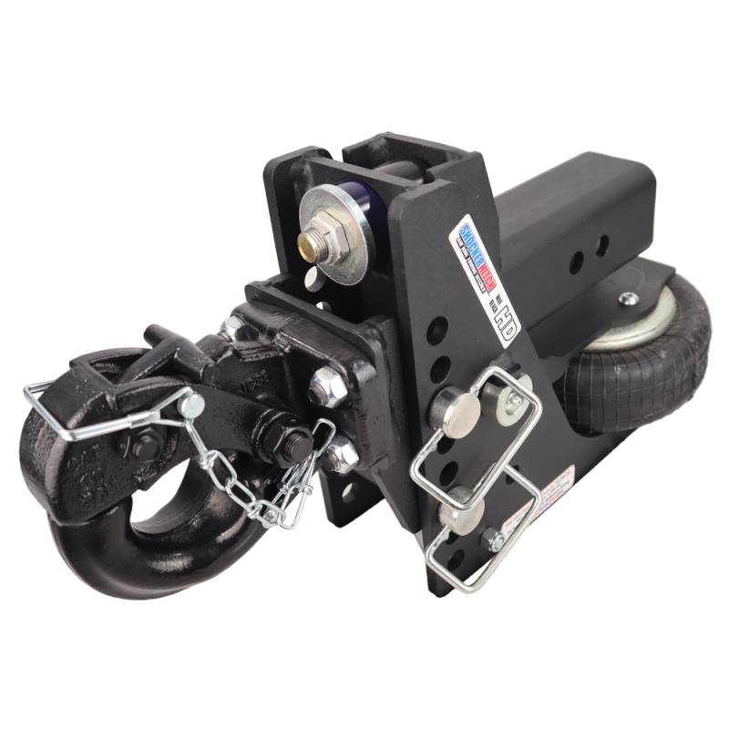 - Air Pintle Hitch Kit includes complete Shocker HD Max Black air receiver hitch with built in 20K air ride system & dual bump cushions, adjustable pintle hook and three d-handle ball mount attachment pins with clips.