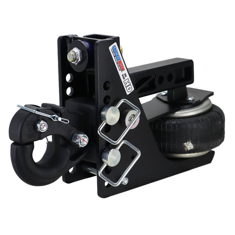 The Shocker HD Max Black Air Pintle Hook Receiver Hitch is the toughest air pintle hitch around. Built to last the HD base frame is finished with an impact-resistant textured matte black finish that will last for years to come. This 10-Ton 20,000 lbs Max Black HD adjustable pintle hook hitch has a built-in air ride system that provides the ultimate smooth towing experience. 8 Adjustment holes that allow for 3" to 7" Drop or 2.5" Rise to 6.5" Drop. The Shocker Air is a miniature air suspension unit mounted between your truck and trailer. This gives you a smooth towing experience for your pickup, trailer and contents. This Shocker mounts by sliding into a standard receiver tube and is built for heavy-duty hauling, equipment, tilt, dump and skid steer trailers, toter homes along with farm equipment, and military-style towing equipment, off road & overlanding trailers. The Max Black HD Pintle Comes with a pintle hook for easy attachment and hook up to a trailer with a pintle ring. This pintle hook fits 6" OD x 2.5-3" ID pintle rings. Great for farm and heavy-duty contractor towing applications for quick hookup and smooth towing. This adjustable pintle has a nice fix because of the design reducing slop and the built-in air ride system smooths out your towing. Often used on-farm applications, contractor trailers, and off-road trailers and works great on pickups, vans, and select SUV’s with the receiver tube under the bumper.