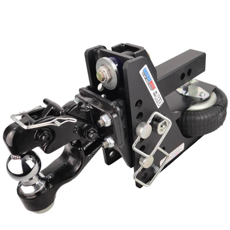 - Kit includes complete Shocker Max Black HD air receiver hitch base frame assembly with built in air bag & dual bump cushions, adjustable pintle ball combo and three d-handle ball mount hitch pins with clips.