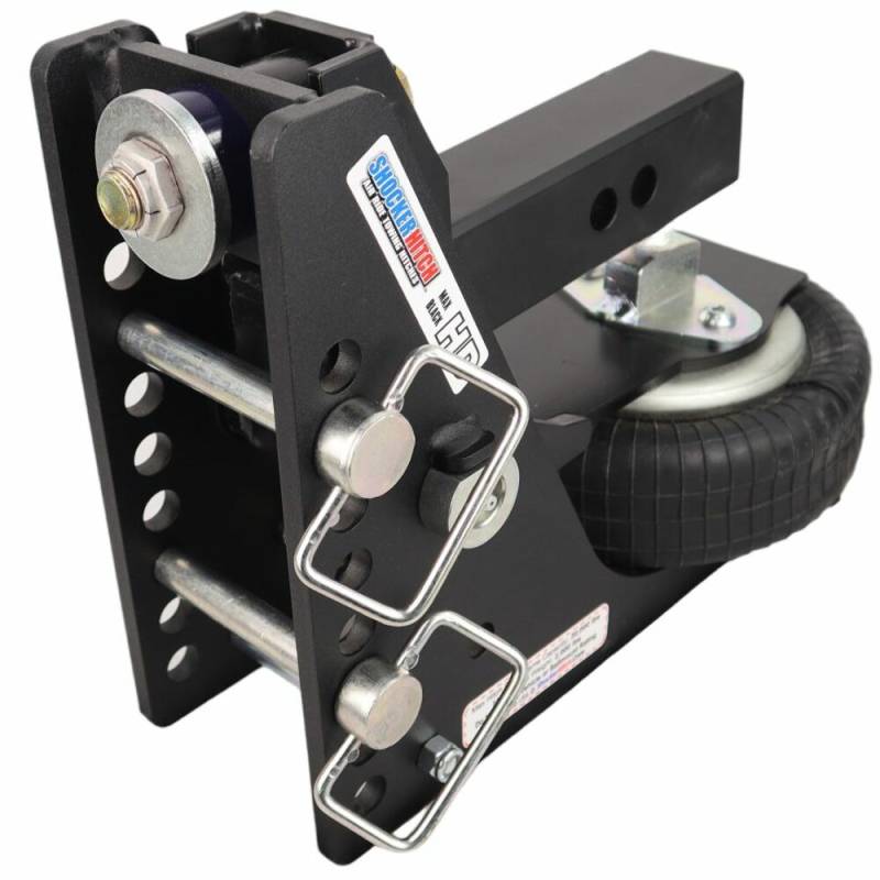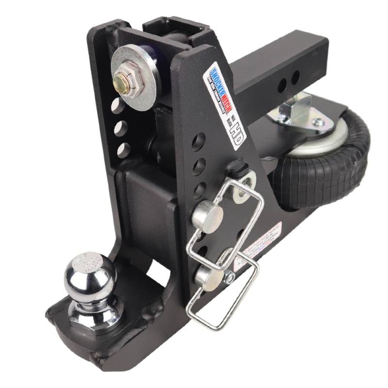 - Kit includes complete Shocker HD Max Black receiver hitch base frame assembly with built in 20K air ride system & dual bump cushions, drop ball mount selected, and 3 d-handle ball mount hitch pins with clips.