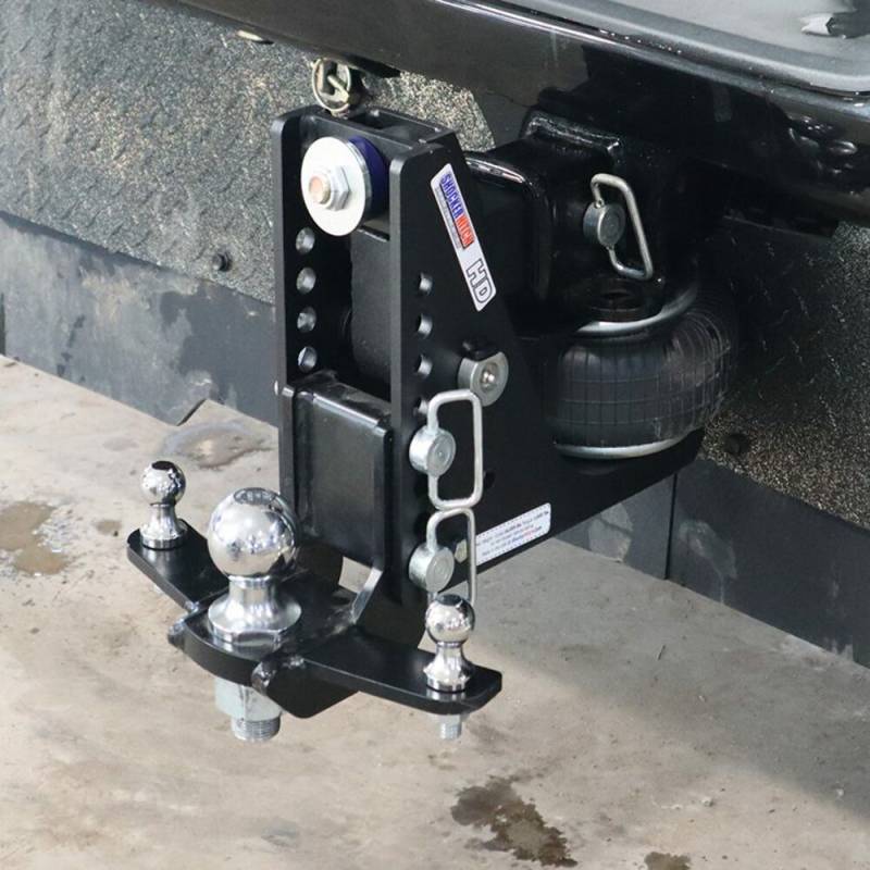 - Comes complete with Shocker Max Black Hitch with in HD air ride hitch, adjustable drop ball mount with 2" or 2-5/16" ball with sway bar mount tabs & three d-handle ball mount attachment pins with clips.