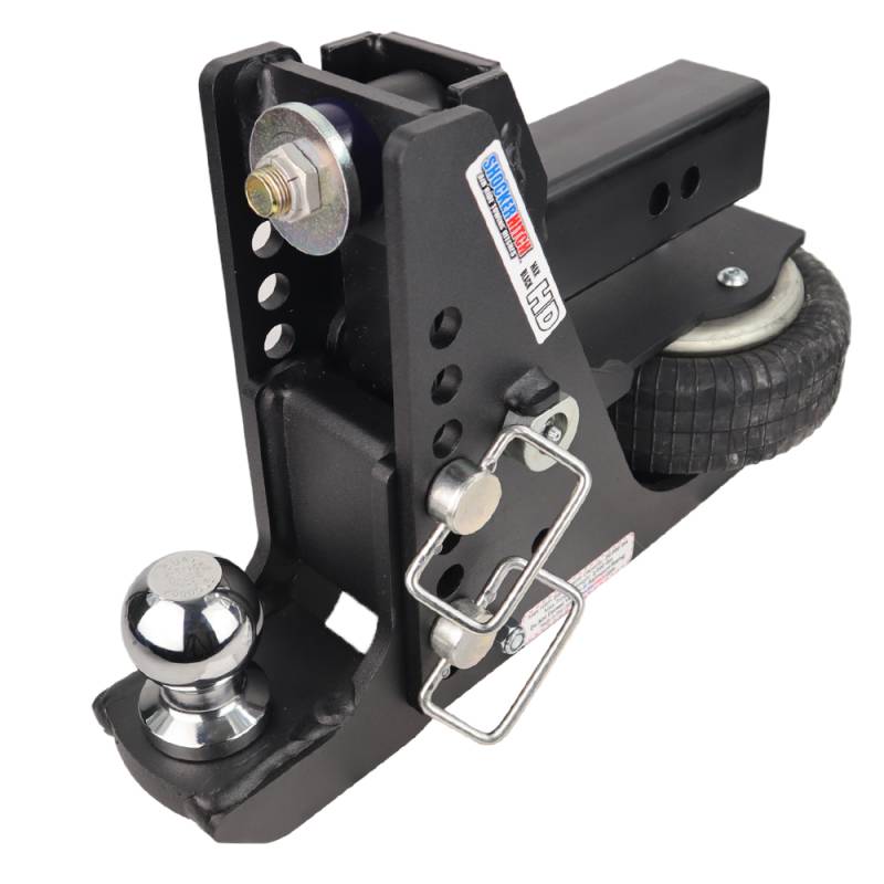 - Kit includes complete Shocker HD Max Black receiver hitch base frame assembly with built in 20K air ride system & dual bump cushions, drop ball mount selected, and 3 d-handle ball mount hitch pins with clips.