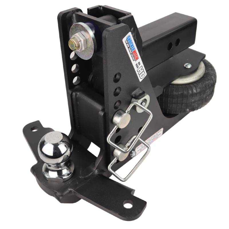 - Comes complete with Shocker Max Black Hitch with in HD air ride hitch, adjustable drop ball mount with 2" or 2-5/16" ball with sway bar mount tabs & three d-handle ball mount attachment pins with clips.