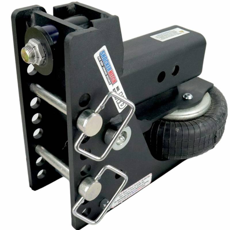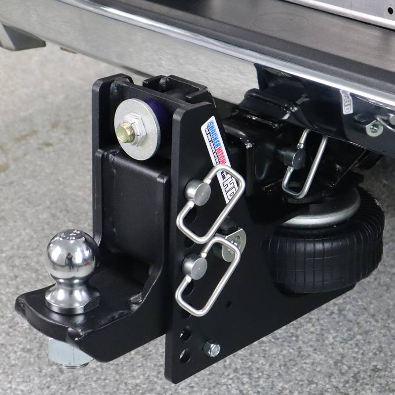 - Kit includes complete Shocker HD Max Black receiver hitch base frame assembly with built in 20K air ride system & dual bump cushions, drop ball mount selected, and 3 d-handle ball mount hitch pins with clips.